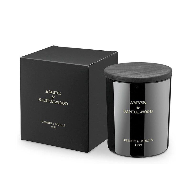 Amber & Sandalwood. Eine betörende Duft-Kombination aus weichen Amber-Noten und herbem Sandelholz wurde raffiniert verwoben mit feinen Vanille-und Zitrus-Akkorden. Die feinen Holz-Aromen wurden im Hintergrund zusätzlich mit einer dezenten Moschus-Note ergänzt. Die Symbiose der kontrastreichen Aromen verleiht der Kerze einen leicht maskulinen Charakter und überzeugt mit einem charismatischen Duft, der sich angenehm im Raum verteilt, auch wenn die Kerze nicht abgebrannt wird. Genießen Sie die erhebend, würzige Atmosphäre von Amber & Sandalwood nach einem arbeitsreichem Tag! Das schwarze Glas wird mit einem eleganten Holzdeckel verschlossen und bewahrt so ein kontinuierliches Dufterlebnis. Die Duftkerze Cereria Molla Amber & Sandalwood ist ein perfektes Geschenk für alle, die Freude an ausdrucksvollen und nicht alltäglichen Parfums und Düften haben.
